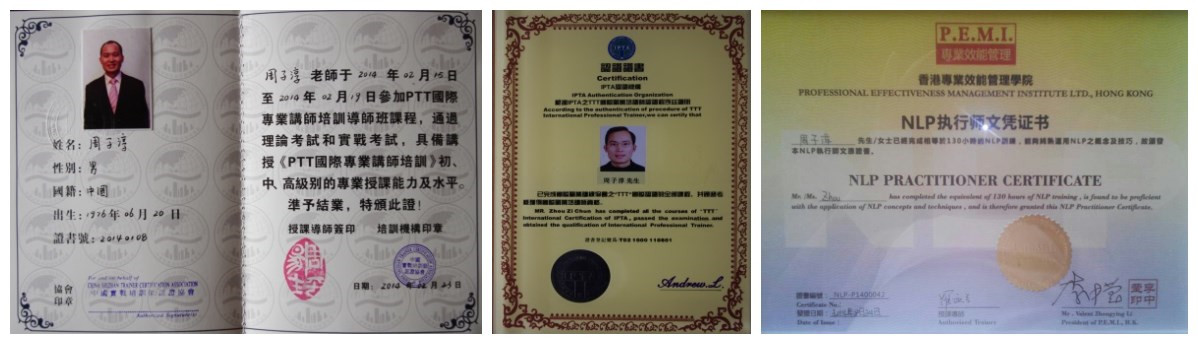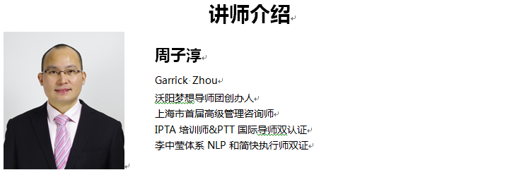 作為職業(yè)培訓(xùn)師,他為眾多企業(yè)如中國移動、中石油等培養(yǎng)內(nèi)部培訓(xùn)師隊伍,輸送上萬名企業(yè)內(nèi)訓(xùn)師,幫助企業(yè)萃取組織經(jīng)驗,研發(fā)內(nèi)部課程,并輔導(dǎo)微課開發(fā)與設(shè)計。 工作之余,他還擔(dān)任多個演講大賽評委,創(chuàng)辦多個公益組織。2009年創(chuàng)辦三一培訓(xùn)師沙龍,2014年加盟《申江服務(wù)導(dǎo)報》旗下大不同劇社,2015年成立沃陽夢想導(dǎo)師團(tuán),2016年發(fā)起上海培訓(xùn)師互助會。 他是國內(nèi)知名路演專家,多次操盤千人招商大會。他把心理學(xué)(尤其是李中瑩老師NLP體系)融入課程,并加入戲劇、國學(xué)、教練技術(shù)、腦科學(xué)等多種元素,深受華潤集團(tuán)、中石化、立白集團(tuán)、中國平安、寧波銀行等企業(yè)認(rèn)可,也幫助眾多微商企業(yè)現(xiàn)場路演和成交。主要項目:招商路演實操與輔導(dǎo),高管演講表達(dá)輔導(dǎo),媒體應(yīng)對輔導(dǎo)。 廣趣儒釋道,愛好身心靈;教練加輔導(dǎo),教化度十方!主講課程如下: 1. 《招商路演》系列:完美路演設(shè)計,招商兵法,說服力與成交。 2、《魅力培訓(xùn)師TTT》系列:呈現(xiàn)為王(授課技巧),微課開發(fā)與設(shè)計,組織經(jīng)驗萃取與案例設(shè)計,戲劇運用與肢體開發(fā),嗓音訓(xùn)練,快速學(xué)習(xí)風(fēng)火輪。 3、《高管教練領(lǐng)導(dǎo)力》系列:高管教練領(lǐng)導(dǎo)力,NLP教練式輔導(dǎo),NLP讀心聚人術(shù)。 4、《國際效能教練》輔導(dǎo)系列:私董會、領(lǐng)導(dǎo)發(fā)言、媒體采訪、競聘輔導(dǎo)等。 5、擅長課程:NLP減壓情商力,跨部門溝通力,了凡四訓(xùn)與積極人生。 客戶評價:氣場一流、互動一流,洞見一流! 部分服務(wù)客戶: 政府及事業(yè)單位:上海市保險同業(yè)公會、浦東區(qū)政府新聞辦、深圳龍崗教育局、南極科考隊; 高校:北大民營企業(yè)家班、復(fù)旦大學(xué)干部班、交大繼續(xù)教育學(xué)院、浙江大學(xué)經(jīng)管學(xué)院、南京旅游職業(yè)學(xué)院; 互聯(lián)網(wǎng):阿里巴巴、騰訊企點、百度上海、谷歌華東區(qū)、雅虎3721、焦點科技、環(huán)迅電子支付、快錢; IT業(yè):英特爾FCBJA部門、HP金橋工廠、源訊、水晶石科技、天虹科技; 日資:三洋能源、麒麟啤酒、帝人化工、旭統(tǒng)電子、島津中國、橫河電機; 韓資:無錫海力士意法半導(dǎo)體、煙臺大宇造船、三星電子、東風(fēng)悅達(dá)起亞; 大型國企:寶鋼發(fā)展、上汽股份、北京郵政、滬東中華造船、浙江漓鐵、南方電網(wǎng)、國家電網(wǎng)、上海電力; 銀行業(yè):上海工行、浙江中行、甘肅農(nóng)行、寧夏建行、交行總行團(tuán)委、重慶招行信用卡中心、浦發(fā)銀行蕪湖分行、平安銀行、南京銀行、寧波銀行總行、中德住房儲蓄銀行、浙江省聯(lián)社、甘肅信合; 制造業(yè):德國施維英、英國諾霸、中路永久、恒力化纖、馳馬拉鏈、盛虹股份; 保險及證券:申銀萬國、平安、大地保險、泰康保險、中國出口信用保險公司; FMCG:加州斯柏克林、卡夫中國(達(dá)能餅干)、恒晟衛(wèi)生用品; 化工業(yè):巴斯夫、瓦克中國、氯堿化工、上海家化; 房產(chǎn)建筑:金地集團(tuán)、寶龍地產(chǎn)、世貿(mào)股份、珠江投資、通和置業(yè)、中建三局、浙江正方; 商業(yè)連鎖:家樂福、歐尚中原店、聯(lián)華超市店長班、九海百盛、蘇新國際; 醫(yī)藥保健:華潤三九、強生中國、阿斯利康、上海醫(yī)藥、信宜藥業(yè)、海南養(yǎng)生堂、沃森生物; 家電業(yè):美的集團(tuán)、格力電器、海立股份、九陽電器、濱特爾、奔騰電器、星星電器; 物流業(yè):上汽集團(tuán)下屬安富物流、安徽交通集團(tuán)、萬創(chuàng)物流、蘇州物流中心,港城汽運集團(tuán); 直銷業(yè):安利中國、月朗國際、如新、富迪、FFI、健龍集團(tuán); 煙草業(yè):寧波煙草、上海煙草集團(tuán)下屬煙草工業(yè)印刷廠、青浦煙草局; 其他:上海外服、中國船級社、歐迪芬工廠、如家酒店上??偛康壬习偌移髽I(yè)。 資質(zhì)證書: 著作: