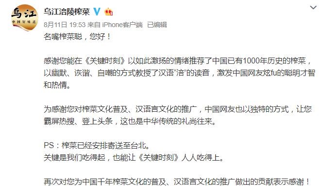 子淳也一直關(guān)注灣灣,兩岸統(tǒng)一是潮流。 大陸吃不起茶葉蛋,買(mǎi)不起榨菜的鬧劇,只能說(shuō)某些帶毒分子,中毒太深,入戲太足,蚍蜉撼大樹(shù),可笑不自量! 涪陵榨菜給臺(tái)灣財(cái)經(jīng)“磚家”黃世聰寄了一整箱榨菜,這個(gè)事件營(yíng)銷(xiāo)很智慧! 寫(xiě)完此文,去超市買(mǎi)榨菜去,耶!