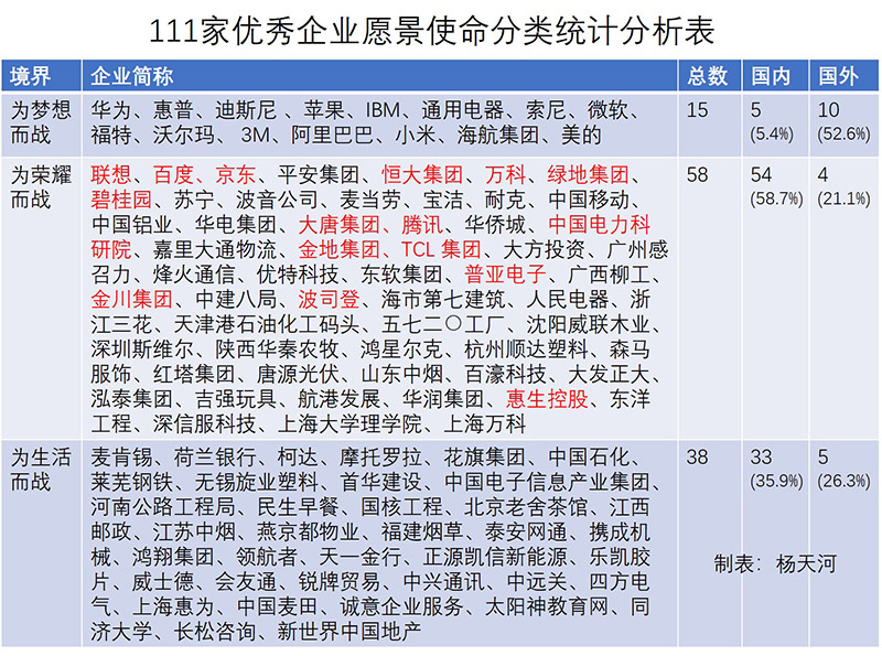通過(guò)111家優(yōu)秀企業(yè)的梳理,結(jié)合其績(jī)效和影響力,我們可以發(fā)現(xiàn): 1、為夢(mèng)想而戰(zhàn)的企業(yè)往往是偉大的企業(yè) 表中,為夢(mèng)想而戰(zhàn)的企業(yè)共15家,除小米外均為頂級(jí)企業(yè)。小米作為一家成立不足十年且擁有眾多粉絲的企業(yè),能夠取得中國(guó)500強(qiáng)企業(yè)并依然有強(qiáng)勁的增長(zhǎng)生態(tài),如果其堅(jiān)持利他精神,不斷為客戶(hù)創(chuàng)造出更多更酷的產(chǎn)品,其成為頂級(jí)企業(yè)也只是時(shí)間問(wèn)題。 2、愿景或使命中有一項(xiàng)為夢(mèng)想而戰(zhàn)的企業(yè),往往是一流企業(yè) 表格中標(biāo)注紅字的16家企業(yè)的使命愿景中均包含一項(xiàng)為夢(mèng)想而戰(zhàn)的要素,他們大多為一流企業(yè)。為夢(mèng)想而戰(zhàn)的企業(yè)更是頂級(jí)一流企業(yè)。也就是說(shuō),愿景與使命中有一項(xiàng)屬于是為夢(mèng)想而戰(zhàn)的企業(yè),往往是一流企業(yè)。 3、真正優(yōu)秀的企業(yè),至少是為榮耀而戰(zhàn)的企業(yè) 通過(guò)表中企業(yè)名稱(chēng)可以發(fā)現(xiàn),絕大多數(shù)優(yōu)秀的企業(yè)處于為榮耀而戰(zhàn)和為夢(mèng)想而戰(zhàn)的境界之中。因此可以得出結(jié)論,真正優(yōu)秀的企業(yè)至少是為榮耀而戰(zhàn)的企業(yè)。 綜上可知,優(yōu)秀的企業(yè)往往是境界高的企業(yè),而且境界越高的企業(yè),所取得的成績(jī)?cè)胶?。反過(guò)來(lái),可以判斷企業(yè)生存境界影響企業(yè)績(jī)效,具體原理如下: 1、為夢(mèng)想而戰(zhàn)的企業(yè),其領(lǐng)導(dǎo)者擁有很強(qiáng)的創(chuàng)新意識(shí)和利他意識(shí),能夠通過(guò)夢(mèng)想激發(fā)員工的自我實(shí)現(xiàn)需求以及創(chuàng)造激情,企業(yè)往往能夠創(chuàng)造出讓人類(lèi)社會(huì)變得更加美好的產(chǎn)品或服務(wù),從而獲得眾多粉絲,最終越來(lái)越好。為夢(mèng)想而戰(zhàn)的企業(yè),其成功是“創(chuàng)新和利他”的成功,本質(zhì)是生存境界的成功。 2、為榮耀而戰(zhàn)的企業(yè),其領(lǐng)導(dǎo)者有很強(qiáng)的榮耀心和企圖心,希望帶領(lǐng)團(tuán)隊(duì)打造為一流企業(yè)。員工在領(lǐng)導(dǎo)的鼓動(dòng)下和績(jī)效推動(dòng)下,被激發(fā)出尊重需求,具備很強(qiáng)的斗志、且十分注重個(gè)人和團(tuán)體的尊嚴(yán),他們積極奮進(jìn),不斷創(chuàng)造新的榮耀。 3、為生活而戰(zhàn)的企業(yè),領(lǐng)導(dǎo)者往往因缺乏戰(zhàn)略眼光或資源整合、戰(zhàn)略管控等能力不夠強(qiáng),也有可能是企業(yè)的治理機(jī)制(如國(guó)企)導(dǎo)致其對(duì)企業(yè)的熱愛(ài)度不夠,導(dǎo)致其所領(lǐng)導(dǎo)的企業(yè)企圖心不太強(qiáng),往往缺少精益求精、做到極致的精神,很難做出令人側(cè)目的成績(jī)。 4、為生存而戰(zhàn)的企業(yè),領(lǐng)導(dǎo)者在戰(zhàn)略規(guī)劃、戰(zhàn)略管控、資源整合三方面的綜合能力相對(duì)較弱,導(dǎo)致企業(yè)績(jī)效相對(duì)較差、員工士氣低落。這種情況下,優(yōu)秀員工的流失進(jìn)一步加劇企業(yè)的問(wèn)題。留下的員工大多也是為生存所迫也很努力,但在方向不清、資源有限、能力不足的客觀(guān)情況下,難以創(chuàng)造出令人滿(mǎn)意的績(jī)效。