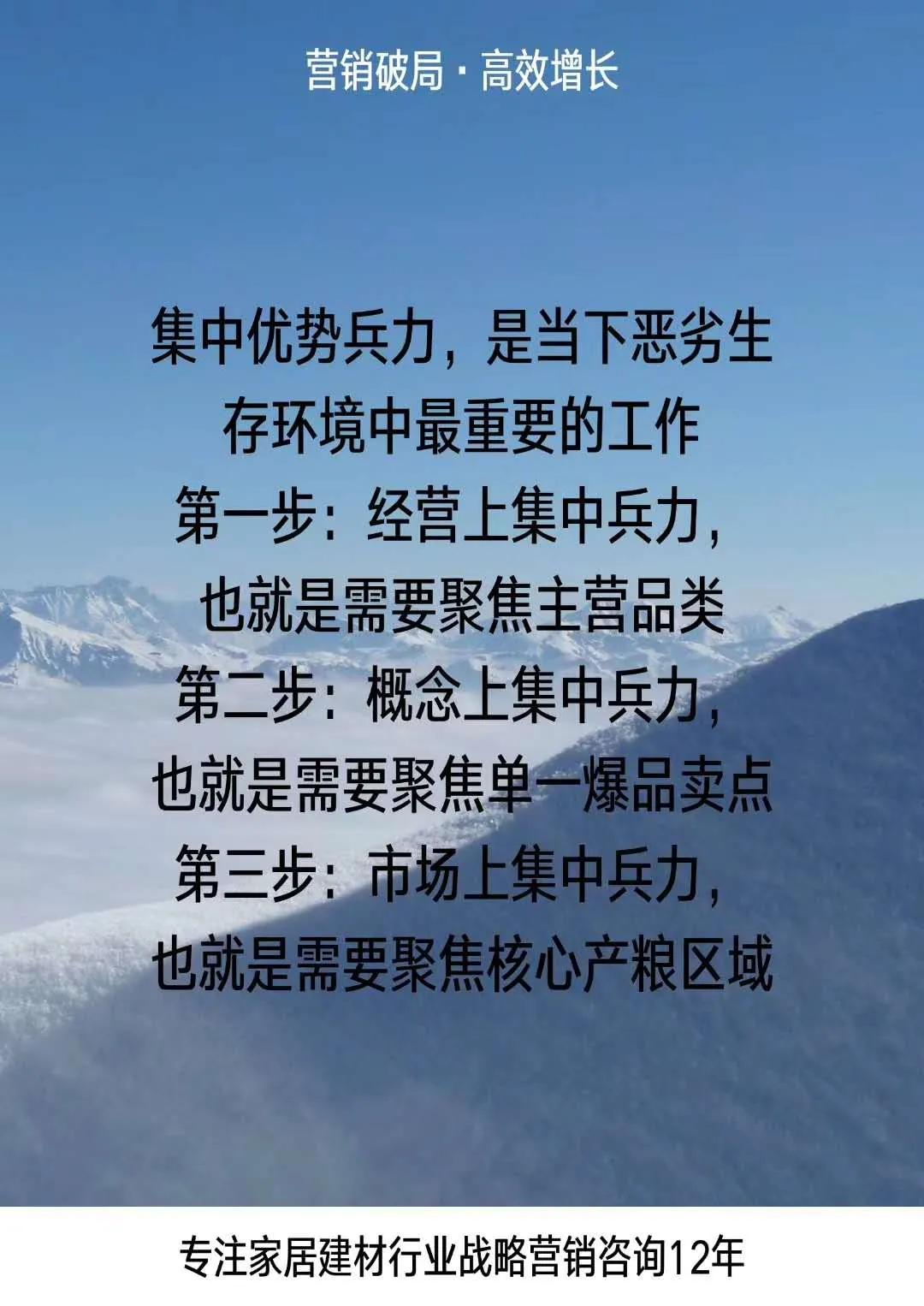 專注家居建材行業(yè)戰(zhàn)略營(yíng)銷咨詢12年 北京和君智業(yè)教育科技有限公司總經(jīng)理 中國(guó)家居建材行業(yè)戰(zhàn)略營(yíng)銷研究中心發(fā)起人 大商公司化運(yùn)營(yíng)專業(yè)顧問 資深實(shí)戰(zhàn)派講師 戰(zhàn)略營(yíng)銷語錄:順勢(shì)而為!集中優(yōu)勢(shì)兵力,是當(dāng)下惡劣生存環(huán)境中最重要的工作: 第一步:經(jīng)營(yíng)上集中兵力,也就是需要聚焦主營(yíng)品類; 第二步:概念上集中兵力,也就是需要聚焦單一爆品賣點(diǎn); 第三步:市場(chǎng)上集中兵力,也就是需要聚焦核心產(chǎn)糧區(qū)域。
