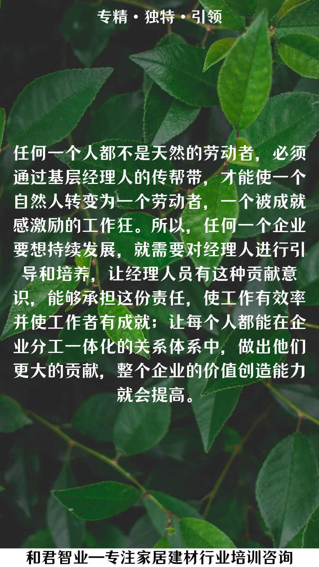 北京和君智業(yè)教育科技有限公司總經(jīng)理 2023中國百強講師 大商公司化運營專業(yè)顧問 資深實戰(zhàn)派講師 戰(zhàn)略營銷語錄:提高企業(yè)價值創(chuàng)造能力!任何一個人都不是天然的勞動者,必須通過基層經(jīng)理人的傳幫帶,才能使一個自然人轉(zhuǎn)變?yōu)橐粋€勞動者,一個被成就感激勵的工作狂。所以,任何一個企業(yè)要想持續(xù)發(fā)展,就需要對經(jīng)理人進行引導(dǎo)和培養(yǎng),讓經(jīng)理人員有種貢獻意識,能夠承擔(dān)這份責(zé)任,使工作有效率并使工作者有成就;讓每個人都能在企業(yè)分工一體化的關(guān)系體系中,做出他們更大的貢獻,整個企業(yè)的價值創(chuàng)造能力就會提高。