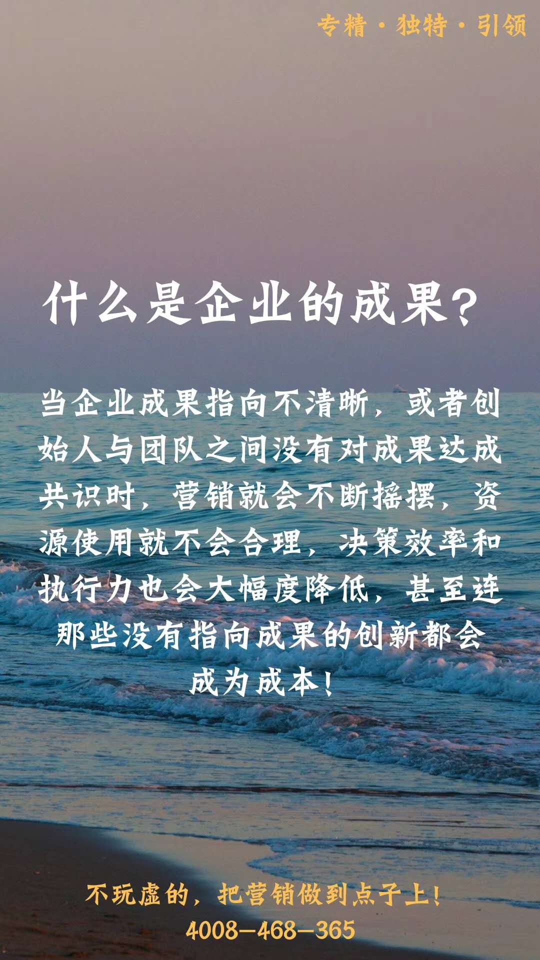 北京和君智業(yè)教育科技有限公司總經(jīng)理 中國家居建材行業(yè)戰(zhàn)略營銷研究中心發(fā)起人 大商公司化運營專業(yè)顧問 資深實戰(zhàn)派講師 戰(zhàn)略營銷語錄:成果導向!什么是企業(yè)的成果? 當企業(yè)成果指向不清晰,或者創(chuàng)始人與團隊之間沒有對成果達成共識時,營銷就會不斷搖擺,資源使用就不會合理,決策效率和執(zhí)行力也會大幅度降低,甚至連那些沒有指向成果的創(chuàng)新都會成為成本!