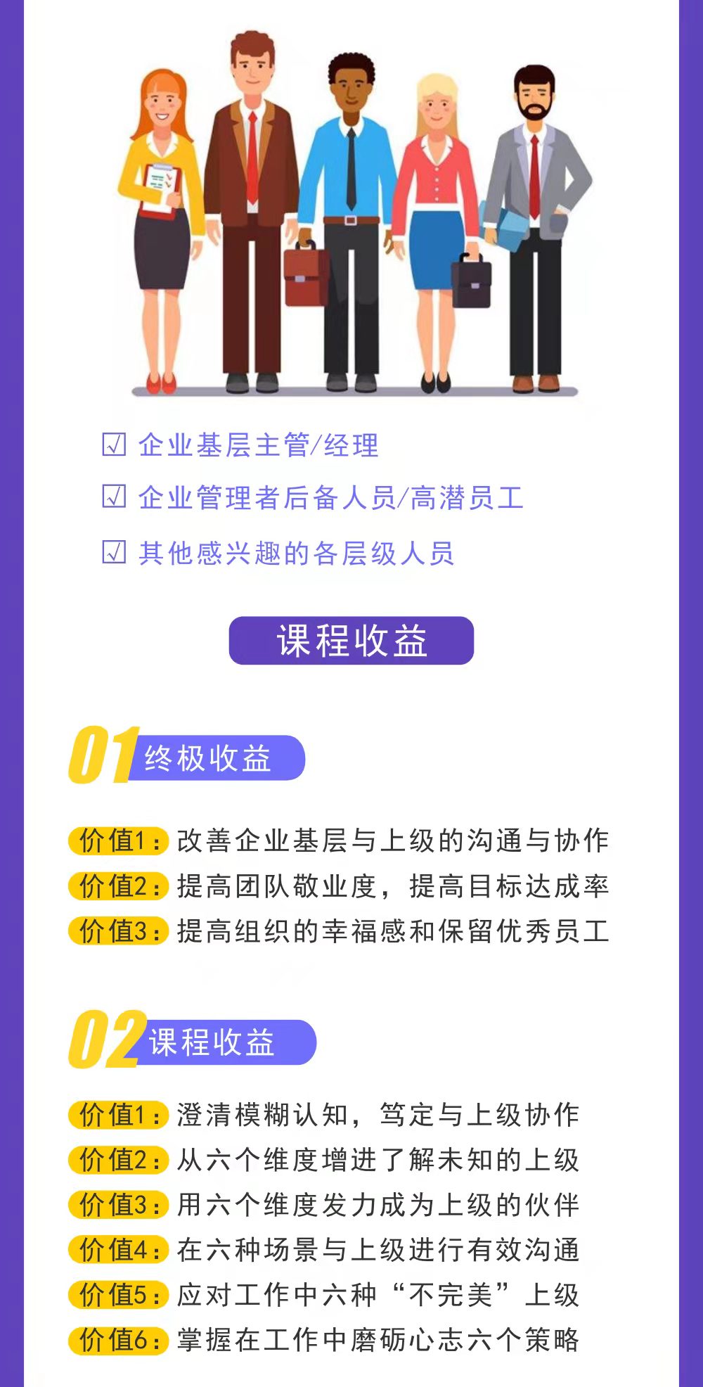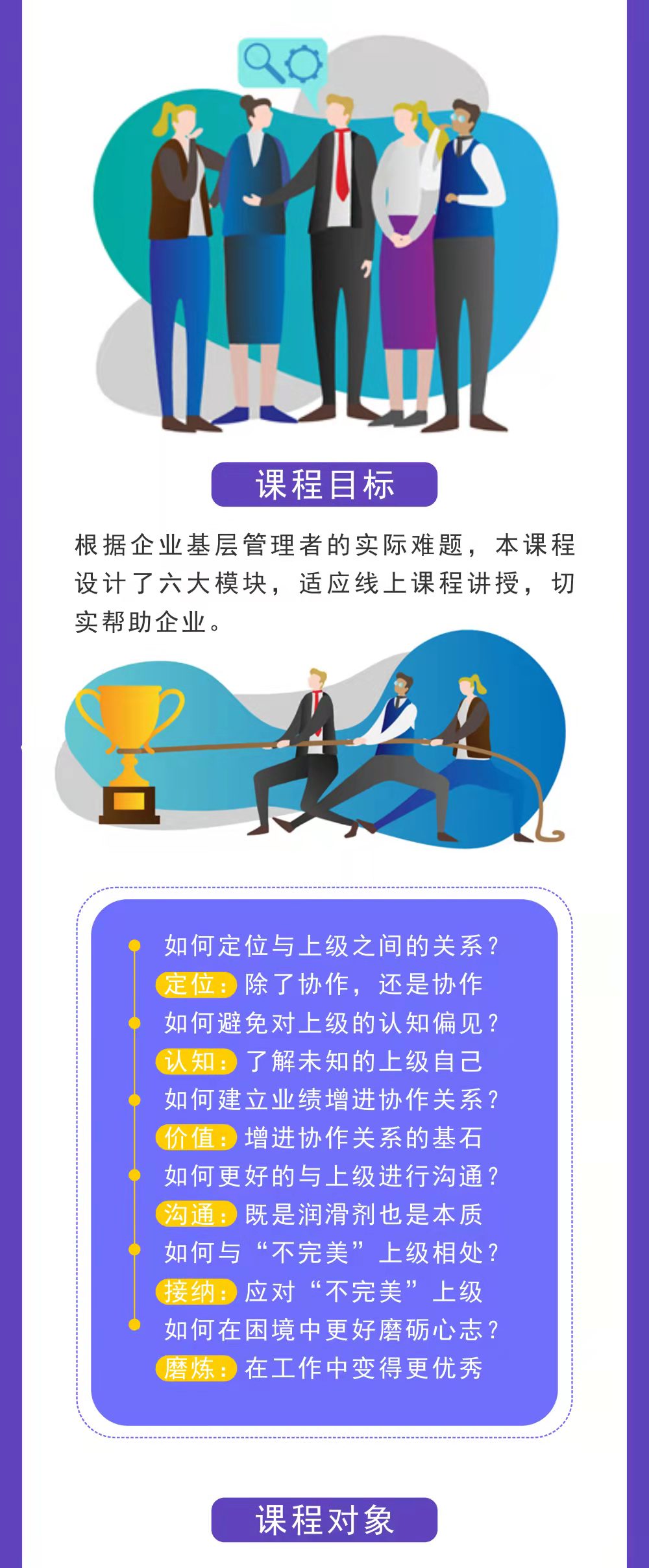 幫助基層主管認(rèn)知正發(fā)生的角色轉(zhuǎn)換(從原來關(guān)注事到現(xiàn)在關(guān)注人與事并重)幫助基層主管應(yīng)對當(dāng)前向上協(xié)作的實際挑戰(zhàn)幫助基層主管應(yīng)對未來職位的挑戰(zhàn)