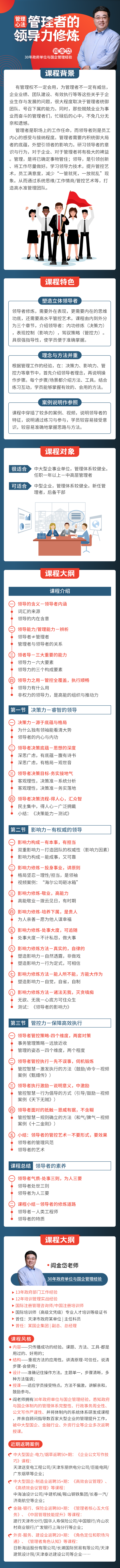 閻老師擁有30年政府單位與國(guó)企管理經(jīng)驗(yàn),悉知政府與國(guó)企體制內(nèi)的管理體系完整性、行政事務(wù)周全性、公文寫(xiě)作嚴(yán)謹(jǐn)性、并將體制內(nèi)的系統(tǒng)體系研發(fā)成課程,并親自顧問(wèn)指導(dǎo)數(shù)百家大型企業(yè)的管理提升工作,被中大型國(guó)企、金融行業(yè)、外資行業(yè)等企業(yè)多次返聘授課。近期返聘案例