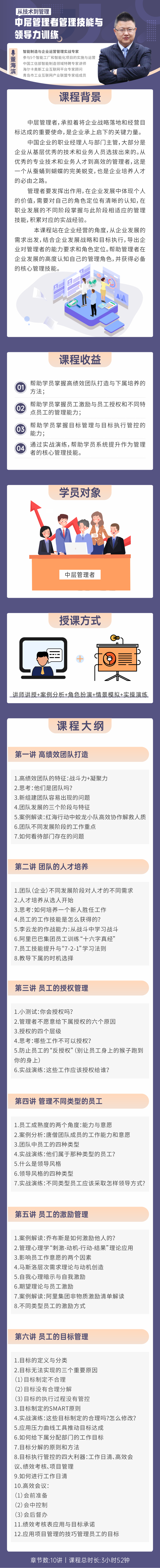 本課程站在企業(yè)經(jīng)營(yíng)的角度,從企業(yè)發(fā)展的需求出發(fā),結(jié)合企業(yè)發(fā)展戰(zhàn)略和目標(biāo)執(zhí)行,導(dǎo)出企業(yè)對(duì)管理者的能力要求和角色定位。幫助管理者在企業(yè)發(fā)展的高度認(rèn)知自己的管理角色,并獲得必備的核心管理技能。