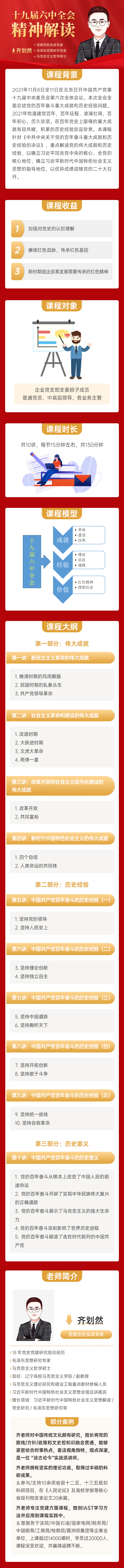 2021年11月8日至11日在北京召開中國共產(chǎn)黨第十九屆中央委員會(huì)第六次全體會(huì)議。本次全會(huì)全面總結(jié)黨的百年奮斗重大成就和歷史經(jīng)驗(yàn)問題。2021年恰逢建黨百年,百年征程,波瀾壯闊,百年初心,歷久彌堅(jiān)。在百年黨史上取得的重大成就有目共睹,積累的歷史經(jīng)驗(yàn)彌足珍貴。本課程針對(duì)《中共中央關(guān)于黨的百年奮斗重大成就和歷史經(jīng)驗(yàn)的決議》,重點(diǎn)解讀黨的偉大成就和歷史經(jīng)驗(yàn),以確立習(xí)近平同志黨中央的核心、全黨的核心地位,確立習(xí)近平新時(shí)代中國特色社會(huì)主義思想的指導(dǎo)地位,以優(yōu)異成績迎接黨的二十大召開。