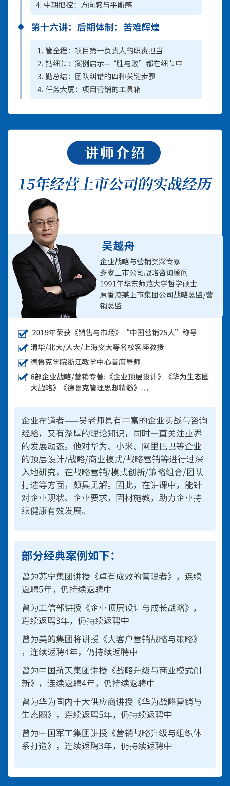曾為華為國內(nèi)十大供應(yīng)商講授《華為戰(zhàn)略營銷與生態(tài)圈》,連續(xù)返聘5年,仍持續(xù)返聘中曾為中國軍工集團(tuán)講授《營銷戰(zhàn)略升級與組織體系打造》,連續(xù)返聘3年,仍持續(xù)返聘中
