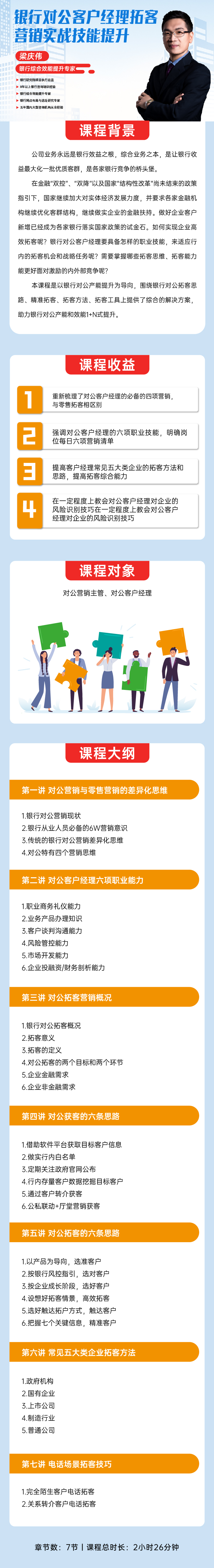 本課程是以銀行對(duì)公產(chǎn)能提升為導(dǎo)向,圍繞銀行對(duì)公拓客思路、精準(zhǔn)拓客、拓客方法、拓客工具上提供了綜合的解決方案,助力銀行對(duì)公產(chǎn)能和效能1+N式提升。