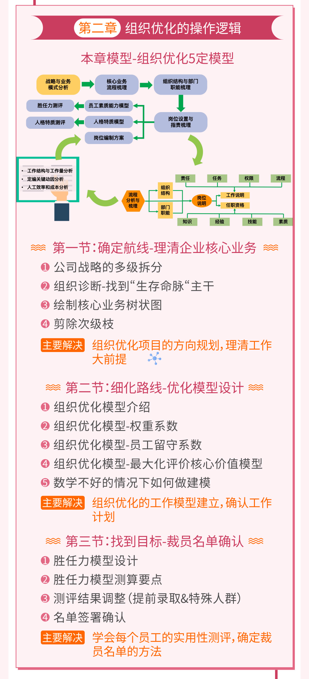 本課程分為上下兩個模塊,針對以上問題進(jìn)行逐個擊破,確保企業(yè)能夠安全、合理、合法的進(jìn)行組織優(yōu)化,幫助企業(yè)瘦身后再戰(zhàn)輝煌!