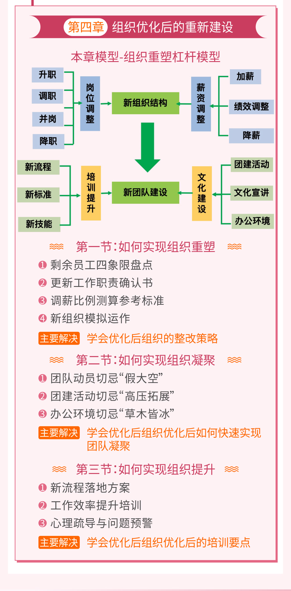 上篇核心解決組織優(yōu)化工作的策略和執(zhí)行,下篇主要講解優(yōu)化過后的組織如何安撫員工、革新績效、建設(shè)企業(yè)文化。