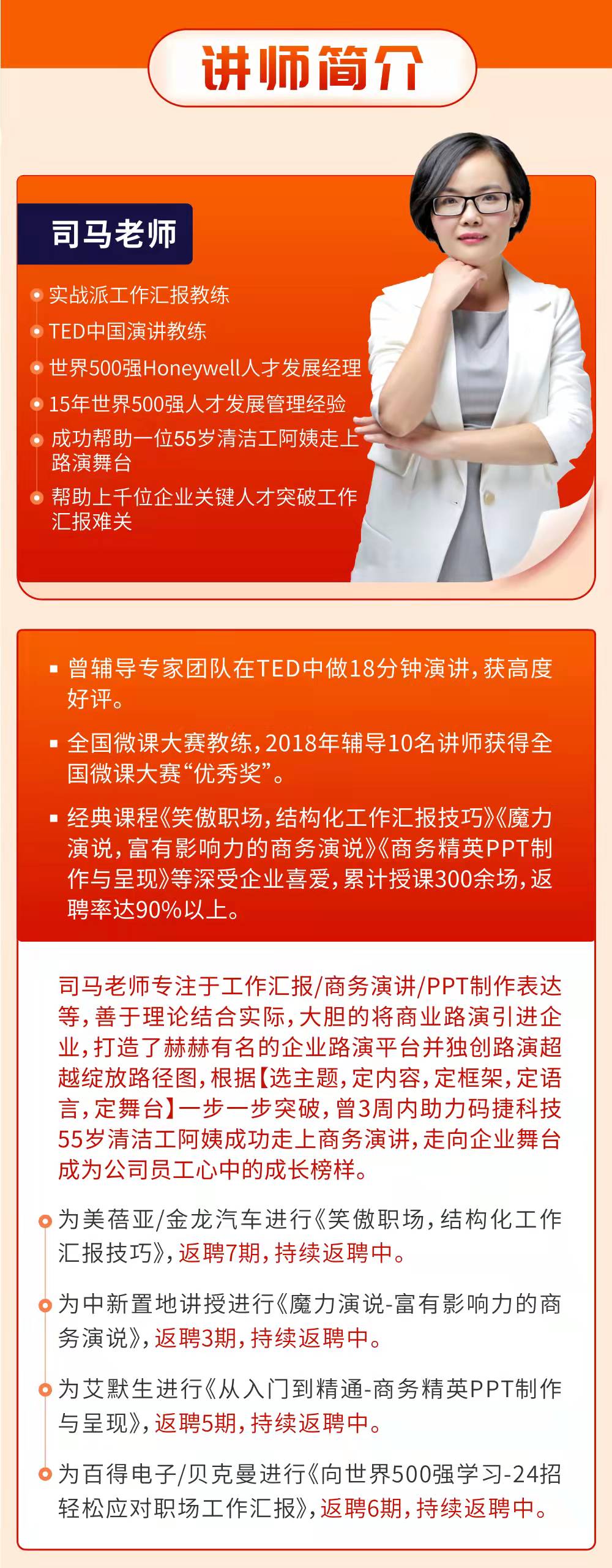 世界500強 Honeywell 人才發(fā)展經(jīng)理,15年世界500強人才發(fā)展管理經(jīng)驗成功幫助一位55歲清潔工阿姨走上路演舞臺,幫助上千位企業(yè)關(guān)鍵人才突破工作匯報難關(guān)