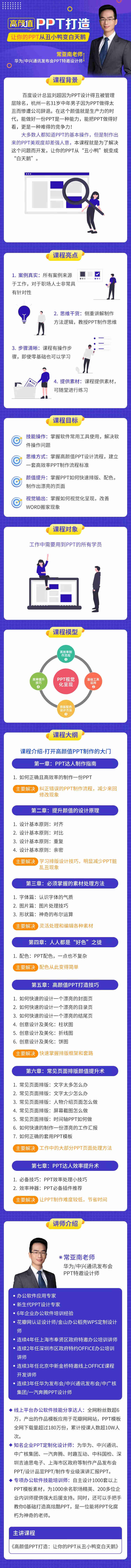 知名企業(yè) PPT 定制化設(shè)計(jì)師:為華為、中興通訊、中廣核集團(tuán)、一汽奔騰、時(shí)趣互動(dòng)、中科國(guó)檢、深圳吉迪思電子、上海市區(qū)政府等制作產(chǎn)品發(fā)布會(huì) PPT /設(shè)計(jì)品宣 PPT /制作專業(yè)級(jí)演講匯報(bào) PPT 。專項(xiàng)辦公軟件技能培訓(xùn)師:自主設(shè)計(jì)1000套以上 PPT 模板素材,為1000余名職場(chǎng)精英、200多位企業(yè)內(nèi)訓(xùn)師提供強(qiáng)大后援支持。同時(shí),還可以手把手教你基礎(chǔ)打造高炫酷 PPT ,是一位能將 PPT 化腐(朽為神奇的老師。