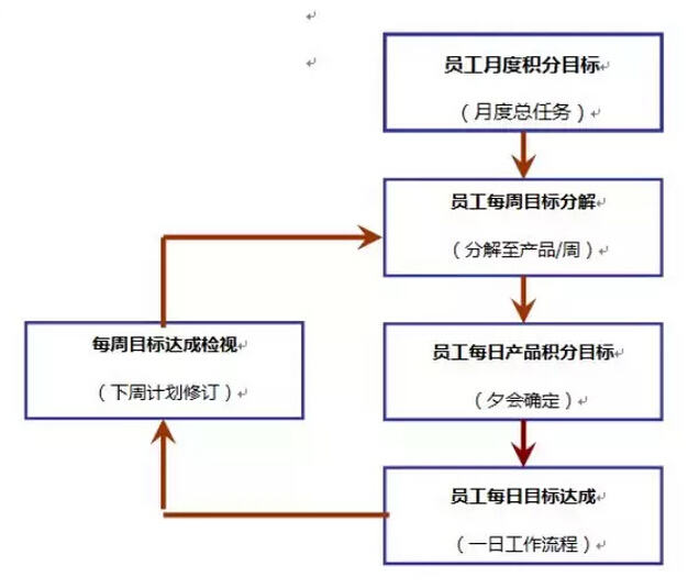 從月到周再到日的目標(biāo)分解后,緊隨的自我目標(biāo)管理環(huán)節(jié)是員工每日目標(biāo)達(dá)成(即一日工作流程),員工于晨會(huì)目標(biāo)宣示后,通過一日工作流程指引,達(dá)成當(dāng)日產(chǎn)品銷售目標(biāo)、過程指標(biāo)及積分指標(biāo)。最后,是每周目標(biāo)達(dá)成檢視(即下周計(jì)劃修訂),員工通過每周計(jì)劃目標(biāo)與實(shí)際達(dá)成情況對比檢視,形成每周自我評價(jià),在營業(yè)經(jīng)理指導(dǎo)下,對下周目標(biāo)進(jìn)行相應(yīng)適度調(diào)整。從而形成員工自我管理的閉環(huán)回路。