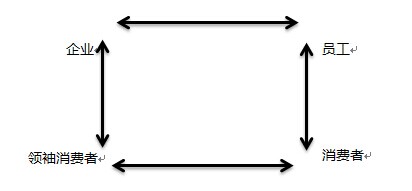 從上圖可以看出,企業(yè)位于方形的左上角,領袖消費者位于左下角,消費者位于右下角,員工位于右上角。方形營銷的基本原則是:在消費者眼中,如果一個品牌或者一家公司的投入足夠多,對消費者產生足夠大的吸引力,那么就能使這些消費者成為積極主動的消費者或者領袖消費者;相反,如果消費者與品牌或企業(yè)的行為理念相左,他們也會表現(xiàn)出同等強度的負面影響力。