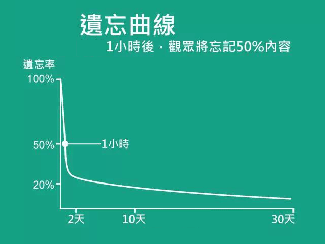 數(shù)據(jù)顯示,在培訓結束一小時后,學員將忘記50%的內容,在2天后將忘記70%的內容,一個月后能記住的只有僅剩20%左右了,絕大部分的課程都已經忘記了,那么這一次的培訓就沒有任何意義了。