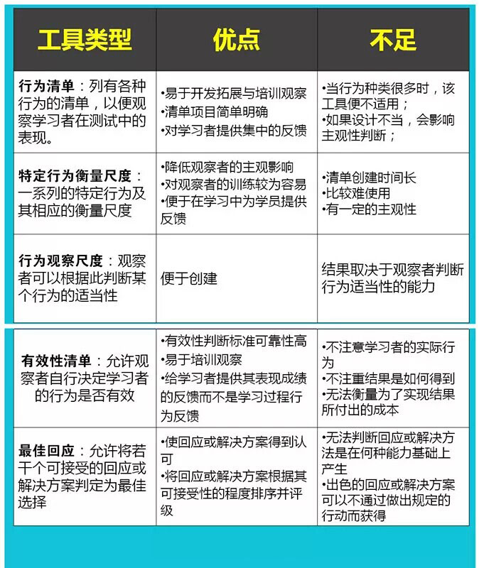 根據(jù)柯克帕特理克(Kirkpatrick)提出的培訓模式中的第三層業(yè)績考核法來進行評估,判斷工具的清單,包括其種類、優(yōu)點和不足,根據(jù)實際情況選擇一種來使用。