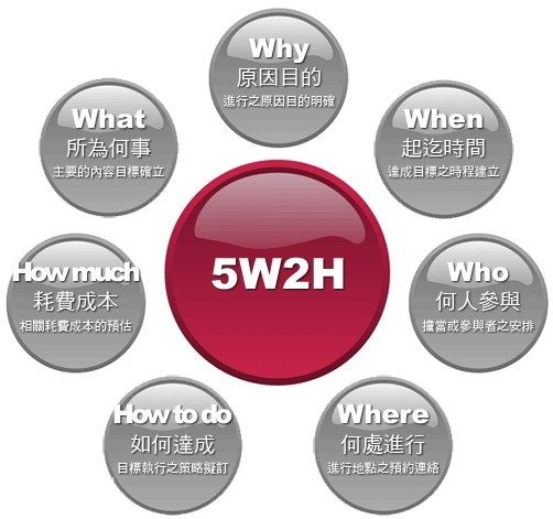 常做培訓(xùn)的朋友都會(huì)知道“5W1H分析法”,即六何分析法,這是一種常見的思考方法,在企業(yè)的管理、日常工作、生活學(xué)習(xí)中應(yīng)用廣泛。但還有一種方法就是“5W2H分析法”,比“5W1H分析法”多了一個(gè)H,即How much,主要用于企業(yè)管理和技術(shù)活動(dòng)。而這里對(duì)于我們進(jìn)行正確、有效的自我培訓(xùn)也是非常適用的,具體說(shuō)來(lái)就是:What、How、Why、When、Where、Who、How much。