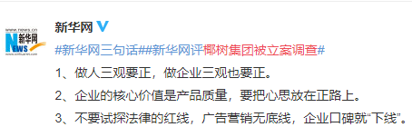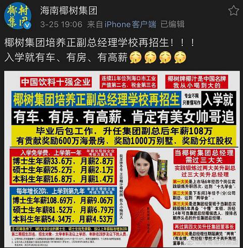 3月25日,椰樹在官方微博上發(fā)布信息招生,招生信息打出沒多久就被海南省市場監(jiān)管局立案調(diào)查,原因是發(fā)布涉嫌違法廣告,我們一起來看下這則廣告。